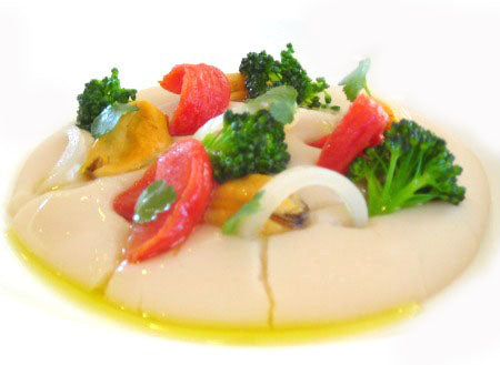 Put beans cream in four dishes adding broccoli tips, four mussels, squids slices and tomato confit.