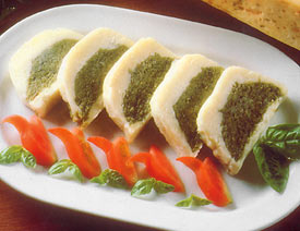 Using a wooden spatula, gradually stir the 2 eggs yolks into the pesto sauce. Combine the pesto sauce with the whole egg in a blender. Butter little timbale moulds and line them with Stracchino, leaving a hole in the middle. Fill with pesto sauce and seal with more Stracchino. Steam for 10 minutes. Turn out the timbale on a plate and allow to cool. Refrigerate for at least 4 hours. Serve with thin slices of tomato.
