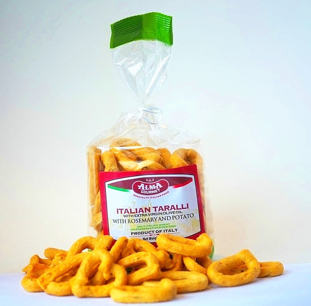 Italian Tarallis are a staple Italian snack food. It is a type of bread common throughout the southern half of the Peninsula. Italian Tarallis are usually doughnut-shaped, about 3 inches across, and are moderately crunchy. They can be either somewhat sweet or slightly salty, and some people sprinkle their surfaces with anise seed, pepper, or whatever.