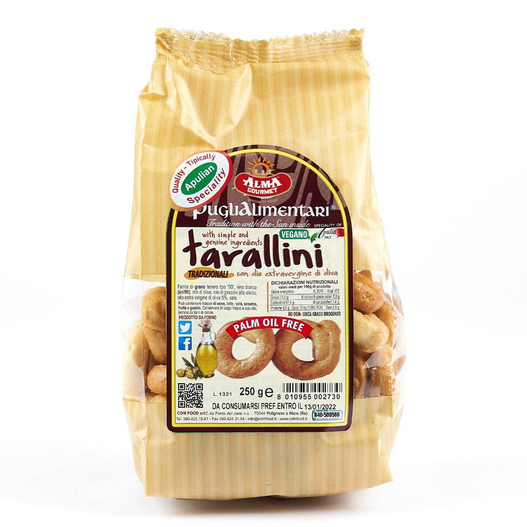 Italian Tarallini are a type of snack or biscuit originating from the Puglia region in southern Italy. While tarallini are enjoyed across Italy, the Puglia region is particularly renowned for its authentic and traditional recipe of these snacks. Made with flour, extra virgin olive oil and white wine, taralli can be made in various flavors and represent a unique staple of the Italian tradition.