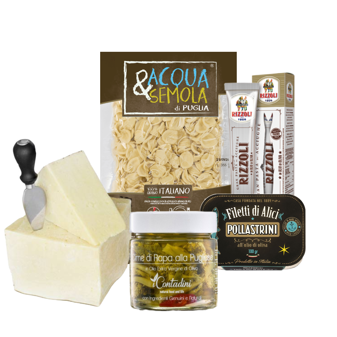 Orecchiette with Cime di Rapa is the signature dish of the Apulian tradition, made with fresh orecchiette pasta and broccoli rabe, two staples of the Apulian cuisine. Alma Gourmet Orecchiette with Cime di Rapa Kit comes with everything you need to make the perfect Orecchiette with Broccoli Rabe according to the Apulian tradition, for a delicious and authentic Italian style meal for 4/5 people ready in less than 10 minutes.