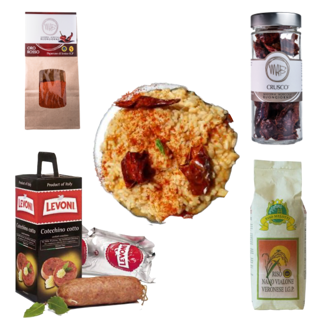 Risotto Oro Rosso with Peperoni Cruschi and Cotechino Kit comes with everything you need to make a top-class Italian gourmet meal and enjoy a unique dining experience.