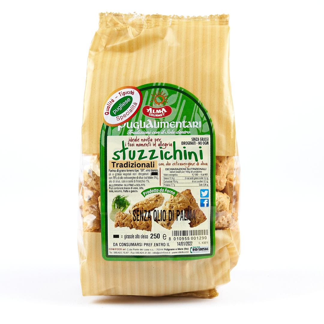 Stuzzichini Tradizionali Pugliesi are small crispy delights, made with simple yet genuine ingredients including flour, water, wine, extra virgin olive oil, and salt. These bite-sized treats represent the Apulian tradition in its most authentic form. Their slightly salty flavor and crispy texture make them the perfect companion for moments of relaxation, as an accompaniment for cheese and charcuterie boards or enjoyed straight from the bag. Enjoy the simplicity and goodness of these stuzzichini Pugliesi and immerse yourself in the culinary experience of Puglia.