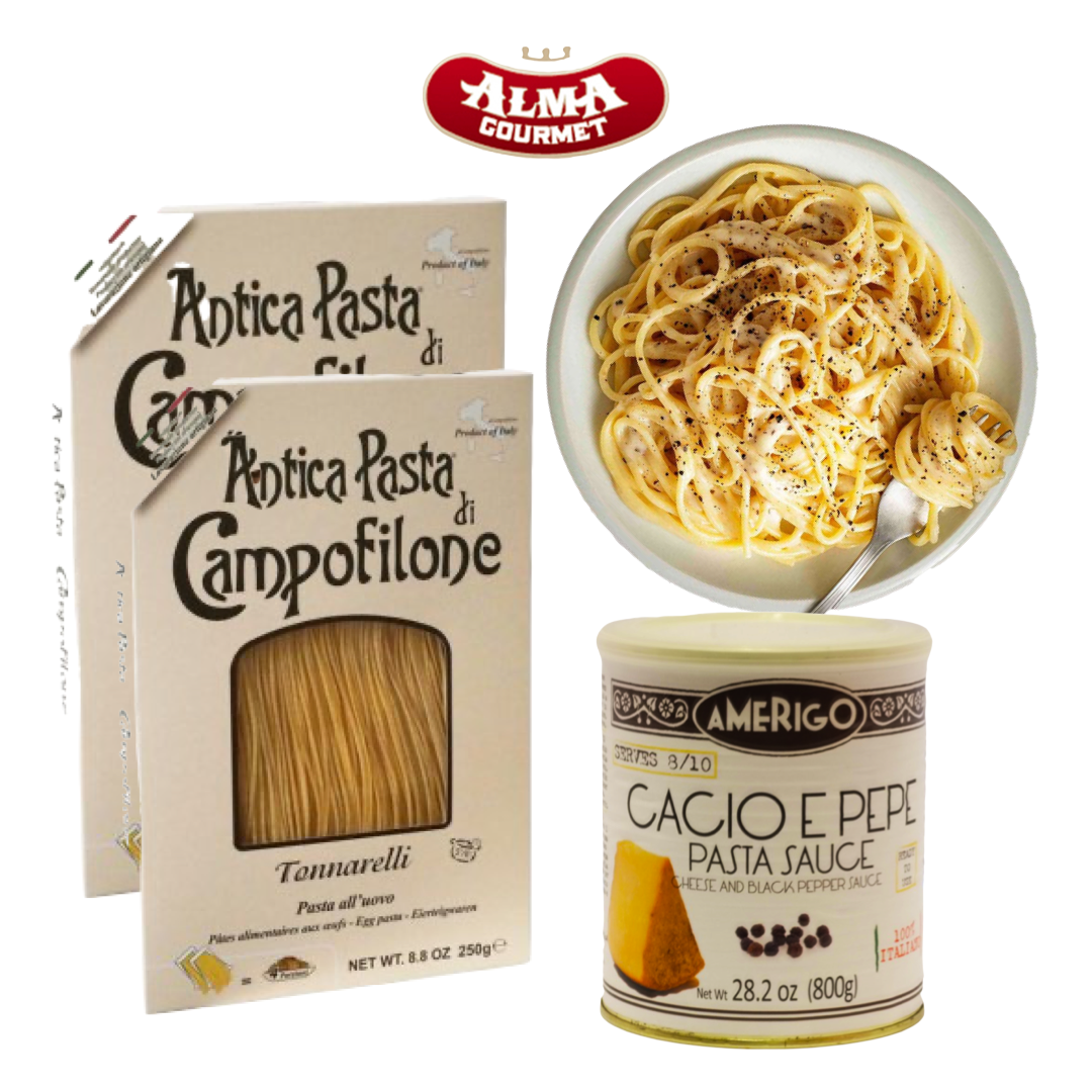 Alma Gourmet Tonnarelli Cacio e Pepe Dinner Kit comes with everything you need to make the perfect Cacio e Pepe pasta according to the Roman tradition, where Tonnarelli pasta is used due to its thickness that make it the perfect pasta for the Roman sauce. With this kit you can prepare a delicious Italian style meal for 6/8 people in less than 10 minutes.