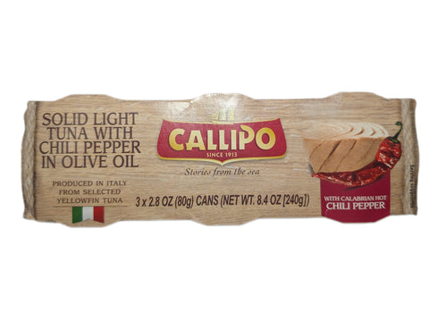 The Tuna Chunks in Olive Oil with Hot Calabrese Chili Peppers from Callipo are tender, flavorful, and low-fat yellowfin tuna chunks enriched with fresh and authentic Calabrese peppers.