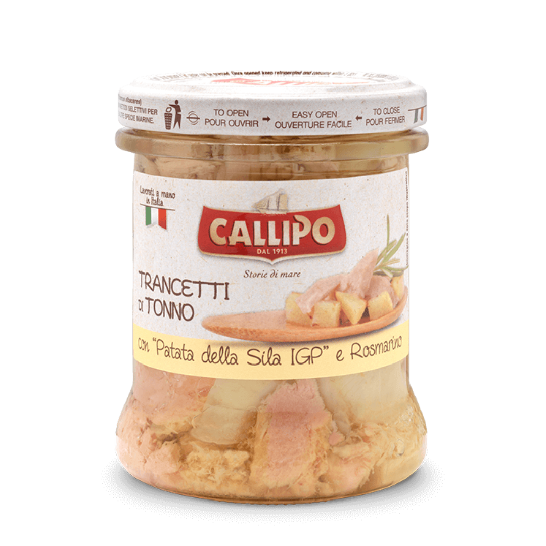 Callipo Tuna Chunks with Potatoes and Rosemary are made from the finest, most valuable tuna, hand-selected for its rich flavor and meaty texture. For the production of the fillets, all processing stages are totally carried out in Italy, in the plant of Maierato (VV), according to the secular Calabrian tradition. After steam cooking, the best fillets are selected and glass jars are manually filled, rigorously complying with food safety dispositions. The seasoning process, then, ensures a typical intense and unique taste. Callipo Tuna Fillets are the only ones containing Iodized Salt Presal, which is “protected” as it is subject to a specific technological process maintaining iodine levels constant even after cooking and in food preparations, and ensuring its assimilation.