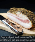 Italian Guanciale is a traditional dry-cured pork jowl, slowly aged for about 3 months with salt and classic Italian spices. The name comes from the word “guancia” Italian for cheek highlighting the cut’s rich marbling and unmistakable flavor.