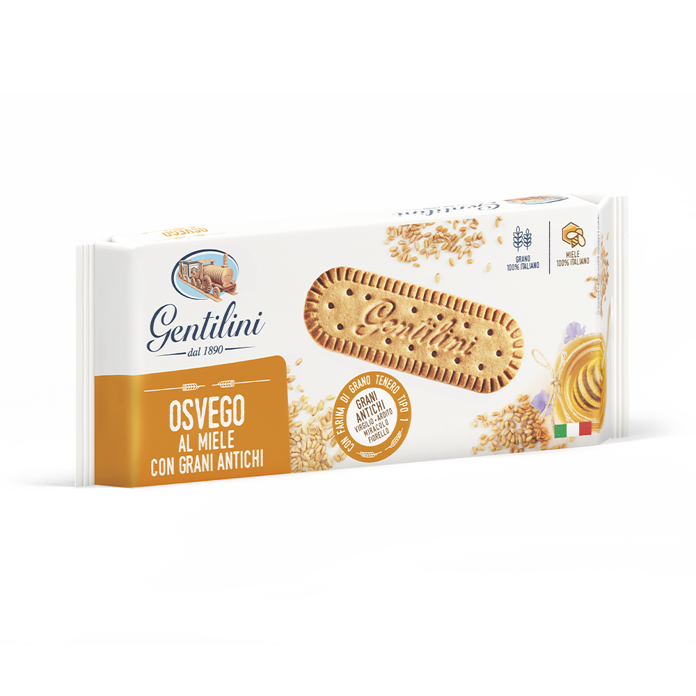 Discover Gentilini Osvego with Honey and Ancient Grains, where tradition meets innovation in every bite. These biscuits are a testament to the rich heritage of Italian wheat and the exquisite flavors of flower nectar honey, sourced exclusively from the Italian peninsula. Crafted with care using 100% Italian wheat flour and a blend of four ancient wheat varieties—Miracolo, Virgilio, Ardito, and Fiorello—these Osvego with ancient wheat grains offer an authentic taste and a unique aroma.