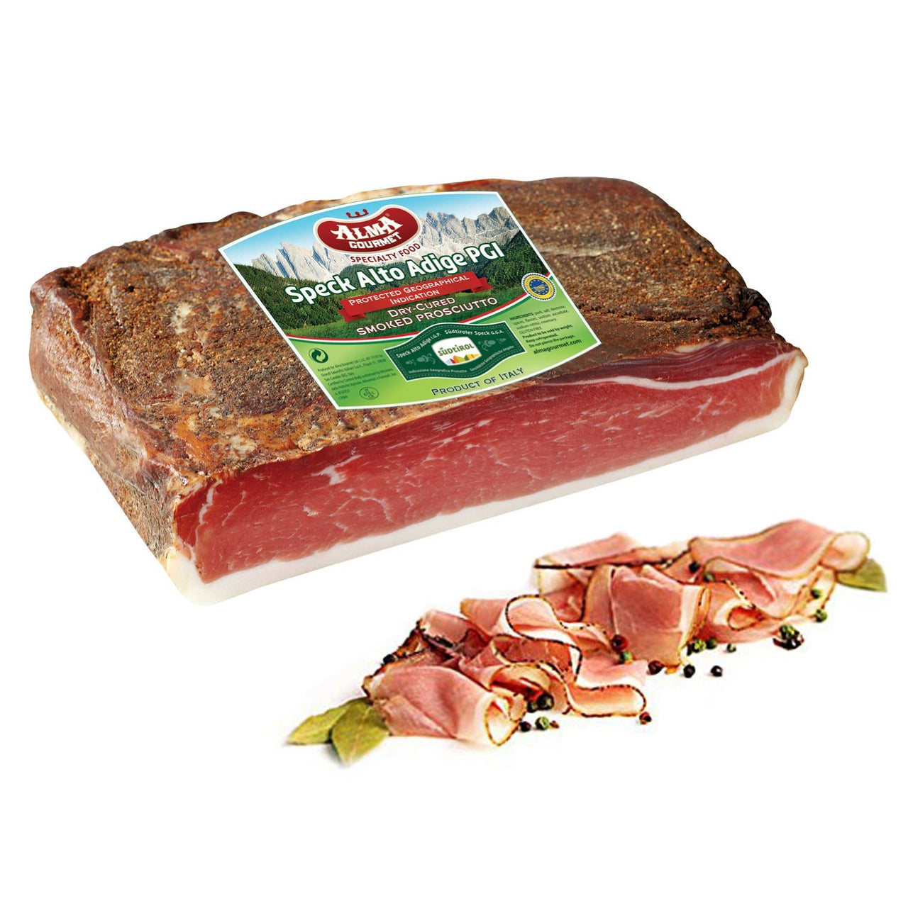 Italian speck, or dry-cured smoked ham, can be traced back to the 13th century; however, the name itself didn’t enter the common use until five centuries later. Originally produced by farmers isolated in the mountains of Alto Adige, Speck’s popularity and production have spread to other regions of Italy. Speck Alto Adige is made from a deboned pig’s rear thigh, that's smothered in a dry-cure of salt and various spices, which often include pepper, garlic, juniper, pimento, and sugar. After about two weeks of curing, the meat is gently smoked over wood for another two to three weeks. Finally, it is left to dry for 20 to 24 weeks, further developing its smoky flavor.
