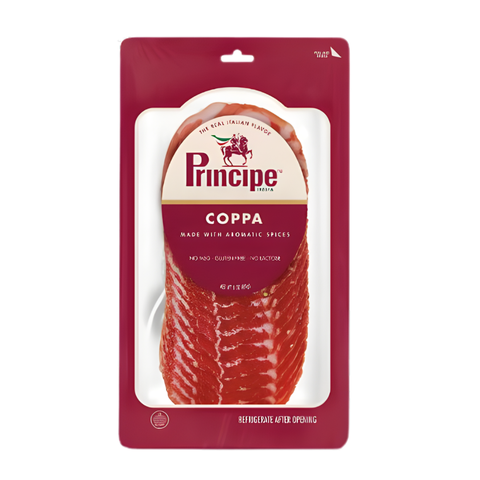Now conveniently pre-sliced for easy serving, Principe Coppa delivers a firm yet delicate bite and a balanced, mildly spiced taste that pairs wonderfully with medium-bodied red wines, nuts, and dried fruits. Its refined flavor and elegant presentation make it a standout addition to any charcuterie board, antipasto platter, or gourmet sandwich.