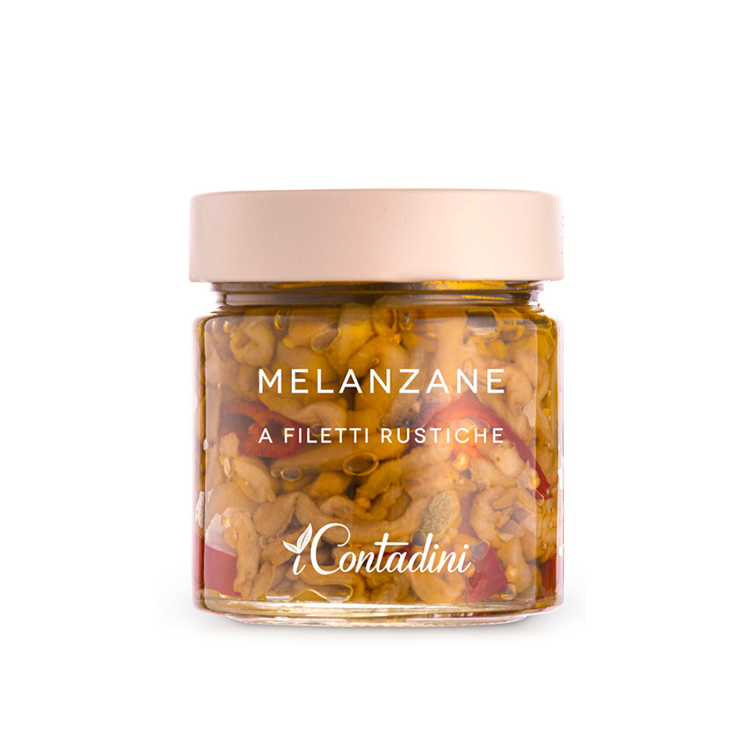 The eggplants are grown in Salento and harvested at peak ripeness between August and September. Every step of the process is done by hand using time-honored methods: the eggplants are carefully selected, peeled, and sliced into thin fillets. To remove any bitterness, they are salted and pressed using the traditional “allu carcu” technique. They are then seasoned with aromatic fresh mint, capers, and a blend of oils and spices, and preserved in sunflower oil with a touch of extra virgin olive oil.