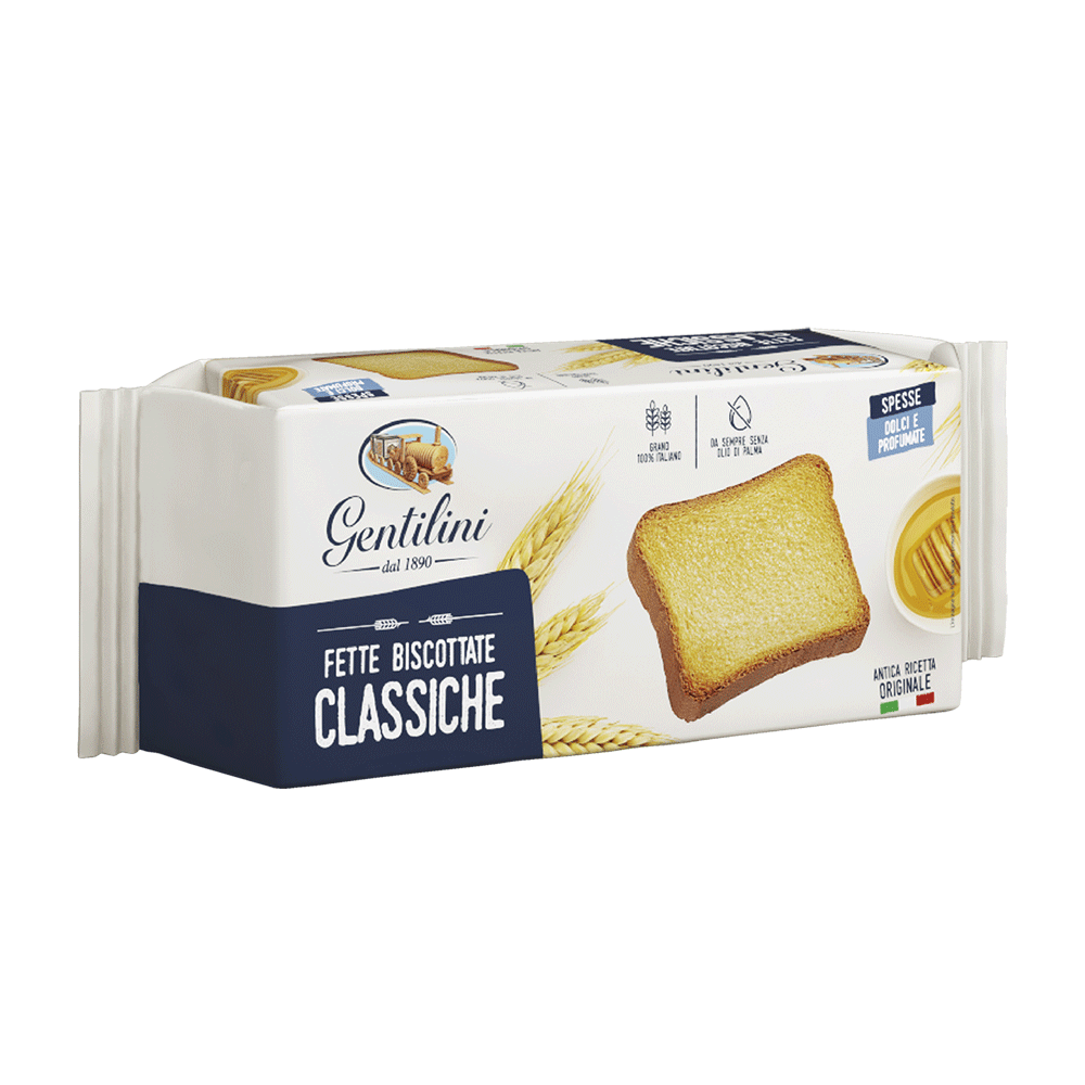 Discover Gentilini Fette Biscottate Classiche, where tradition meets perfection in every slice of these sweet rusks. More than just a toast, each rusk embodies a celebration of craft tradition and uncompromising quality. Delicately sweet and finely fragrant, our classic rusks are a testament to simplicity and natural goodness.