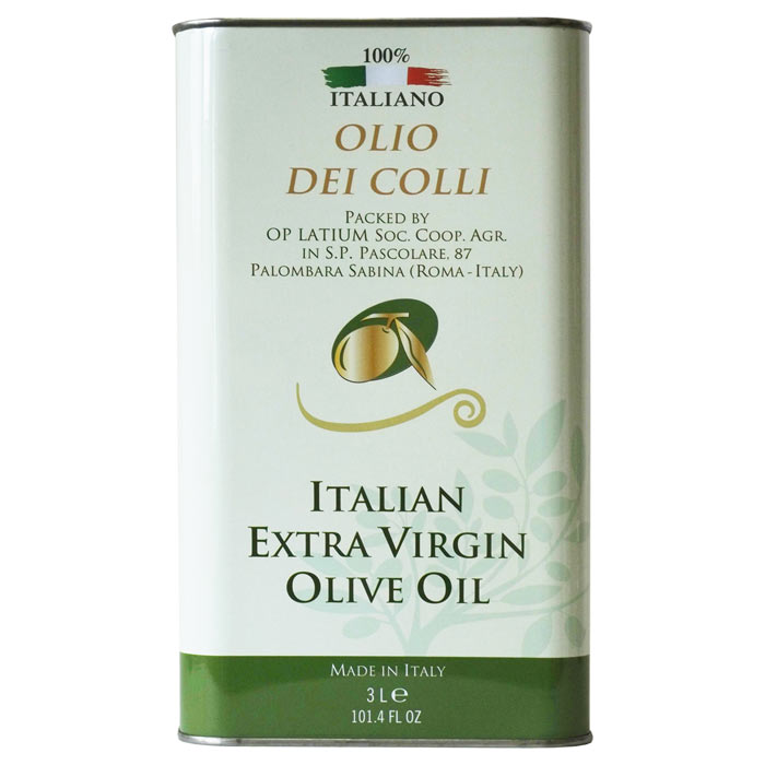 Olio dei Colli Sabina Extra Virgin Olive Oil, 3 liter Tin Can. A few kilometers away from the Eternal City Rome, in the Sabina, there are in fact our three olive mills, modern facilities directly managed by us in the heart of a land famous for its long tradition of olive growing. The olives that can be used to obtain this olive oil produced in the territory of the Sabina suitable for the production of oil with the characteristics and quality. Olio Dei Colli has a yellow - green color with golden shades, its taste is fruity, velvety, uniform, aromatic, sweet, bitter and spicy for fresh oils.