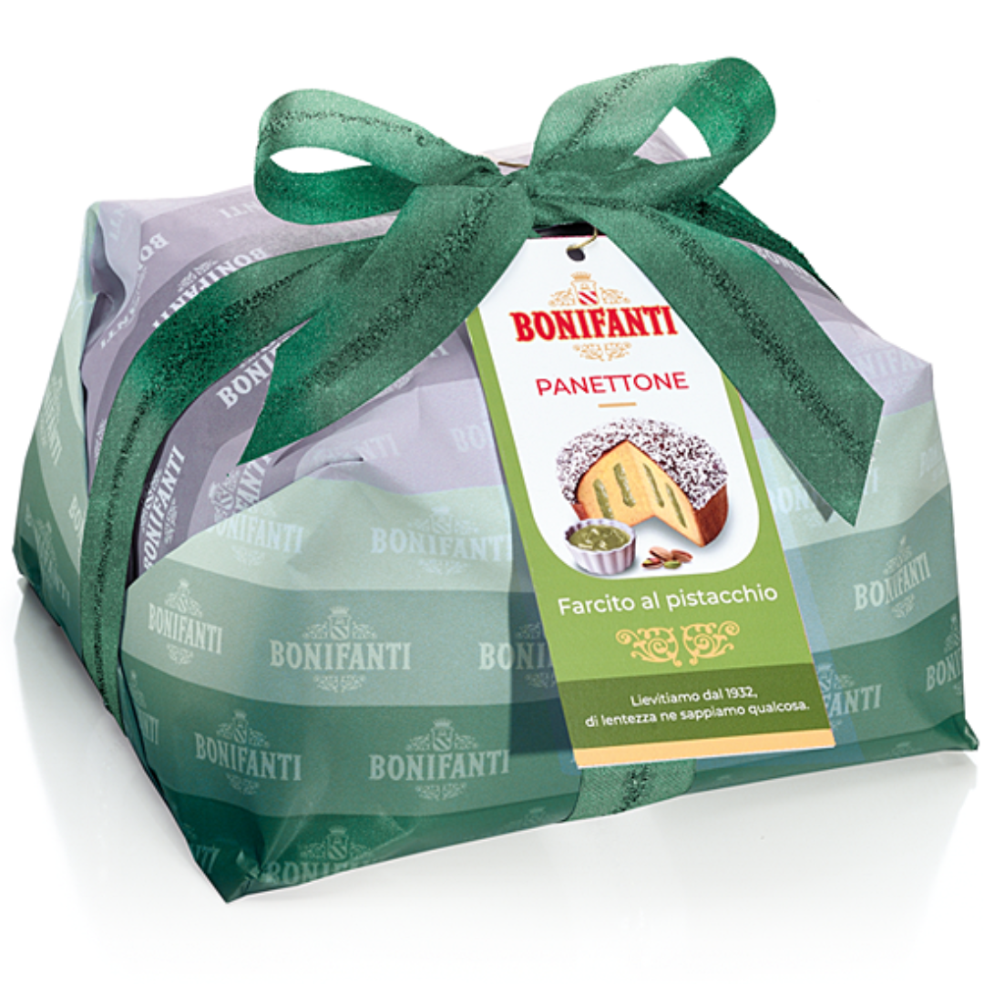 Bonifanti Panettone Filled with Pistachio Cream is made with selected flours, first choice butter and fresh eggs, enriched with a creamy pistachio spread filling with almond fragrance and orange blossoms. The top of the cake is covered with a cocoa glaze and decorated with white chocolate flakes. Precious ingredients, cooled at room temperature and hand-wrapped.