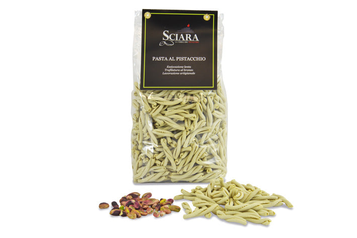 Sciara Caserecce Pistachio Pasta is a specialty handmade bronze drawn Pasta enriched by the taste of Pistachio. This slow drying pasta is made of only two simple ingredients: Sicilian durum wheat semolina and Sicilian pistachios.