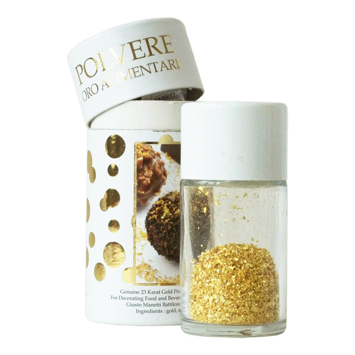 Used for adding a touch of light to dishes given their size and brightness, these are perfect for decorating dishes and pastries. Easy to use, this products is no longer exclusive to chefs and can be used for any special occasion. They come in a handy shaker which facilitates its application. Manetti produces the finest European edible gold and silver available, they are certified by the LGA laboratories and respond to the European regulations regarding alimentary colorants for the decoration of food and drinks. Edible gold is classified as a natural food additives. Gold is classified as E175.