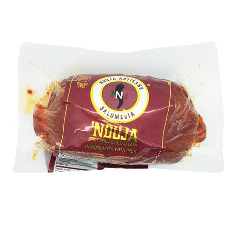 'Nduja is a spicy spreadable Calabrian style salami. This domestic product is the most authentic outside of Calabria. Nduja is a soft and spicy spreadable salami considered to be one of the most famous of typical Calabrian foods. Nduja originates from Spilinga, and its name comes from the french word "andouille" which means "sausage". Nduja is made with pork meat, a bit of fat, salt, and a lot of red pepper. Nduja is often considered an aphrodisiac food due to all of the red pepper in it, and is also great for the heart and tastes wonderful.