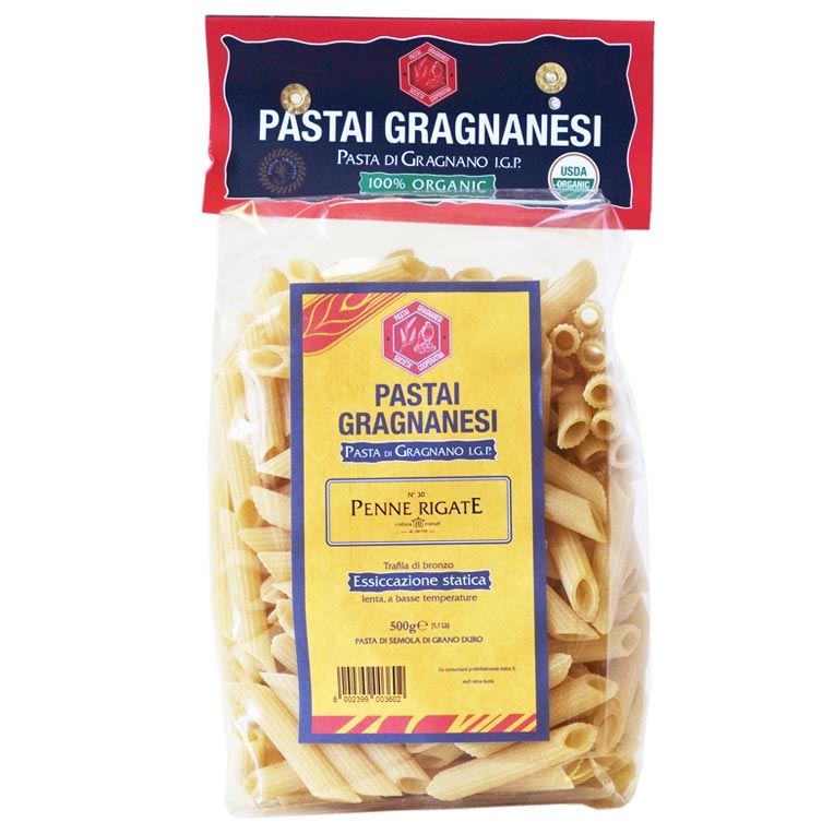 Organic Penne Rigate Pastai Gragnanesi I.G.P. (Protected Geographical Indication). The Italian Pasta di Gragnano is chewier, nuttier and more rough textured than most supermarket brands. In Italy, pasta is a "sacramental" object which its serving is regulated by steadfast traditions. Pasta is fed to infants as soon as they are able to take in solids, and in Italian households, its place as a first dish at lunch or dinner is virtually a law.
