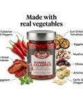 Ingredients: mixed vegetables (calabrian chili peppers, mushrooms, sun-dried tomatoes, eggplants, olives, carrots, peppers, turnips, artichokes), sunflower oil, salt, oregano, garlic, wine vinegar, citric acid, ascorbic acid.