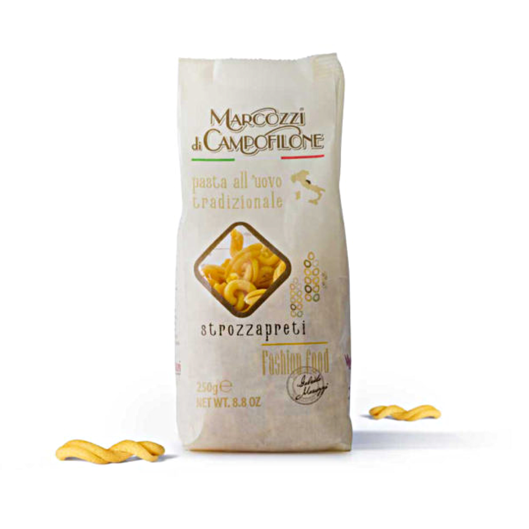 Enjoy the wonderful 15mm wide pasta with your favorite sauce, such as in the brands with pieces of angler fish, fresh scampi and vegetables. They dry on a special paper, which is even packed with them to maintain their shape and natural taste. There is a recipe for Strozzapreti Campofilone on the elegant packaging. The packaging beautifully combines tradition with modernity. The pasta is made with 100% Italian eggs and drawn on bronze molds.