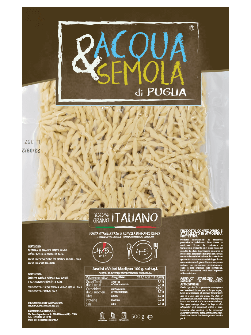 The pasta is made from selected 100% organic durum wheat without coloring, preservatives or flavor enhancers according to the Italian style. Very popular with chefs, it is often found in restaurants and specialty shops in the region.