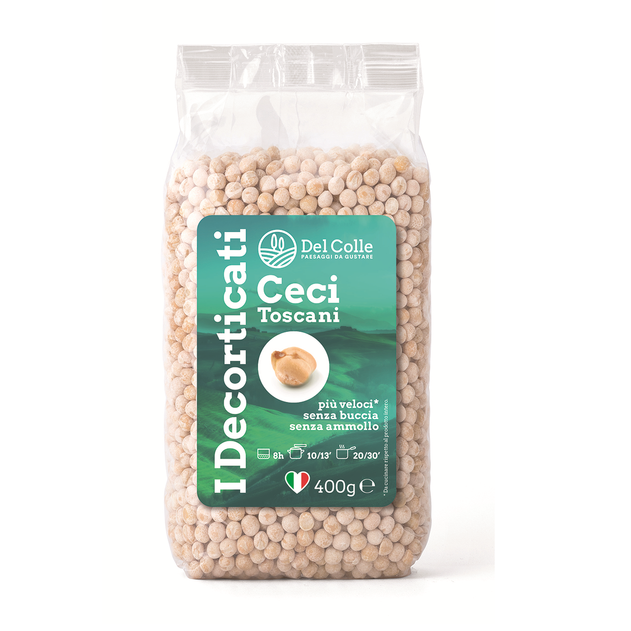 Del Colle peeled chickpeas undergo a mechanical process that removes the outer skin, allowing them to cook more quickly without losing their natural flavor and nutritional value. A great source of fiber, protein, and essential minerals, these chickpeas are a versatile addition to your kitchen. Ideal for a variety of dishes, these chickpeas are perfect in side dishes, soups, purées, salads, patties, and veggie burgers.