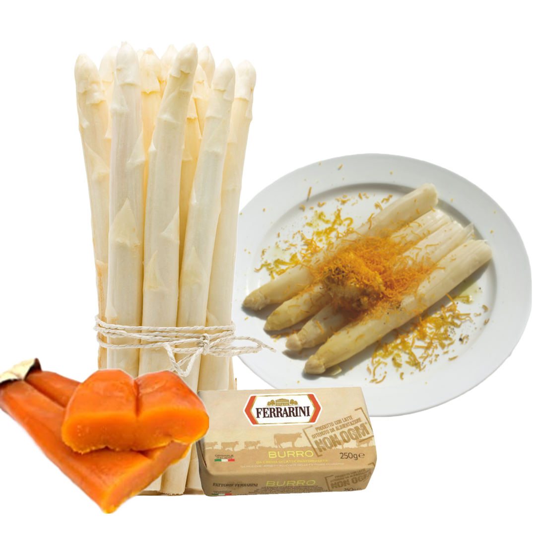 Prepare the white asparagus by removing around 1/2 inch from the woody end of each spear. Use a vegetable peeler to peel each asparagus almost to the tip. Cook the asparagus in boiling salted water for 6/8 minutes until tender and drain. Put a generous amount of butter in a pot and add the asparagus. Cook for 2 minutes. Grate over as much bottarga as you like and cook for another minute. Serve in a plate and finish with grated bottarga.