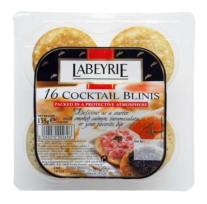 Labeyrie Russian style pancakes. Since its creation in 1946 has built up an unrivalled image and brand awareness worldwide. These Blinis are always a must at cocktail parties, they are ideal fit for serving with caviar, smoked salmon, crab, cheese or many other toppings and spreads. Be creative!