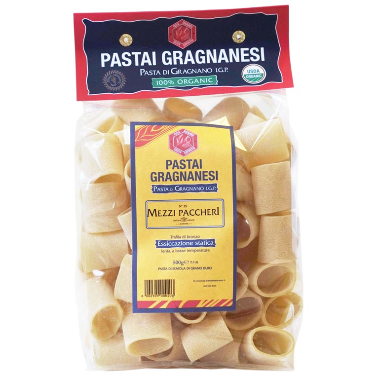 Organic Mezzi Paccheri Pastai Gragnanesi I.G.P. (Protected Geographical Indication). This cut was inspired by the classic Paccheri, but in a small size. This shape is exactly a half (mezzo) of the bigger shape Paccheri. It originated in the region of Campania in Italy.