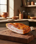 Pancetta Tesa Ibérico de Bellota is a premium cured pork belly made from free-range Ibérico pigs raised on the dehesas of Spain. During the final fattening season (montanera), these black-hoofed pigs roam oak forests and feed almost exclusively on acorns (bellotas), giving the meat its signature sweetness, richness, and unmatched depth of flavor.